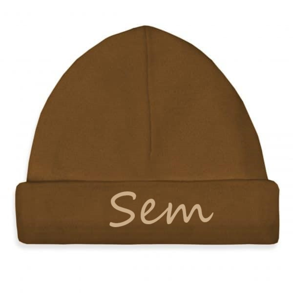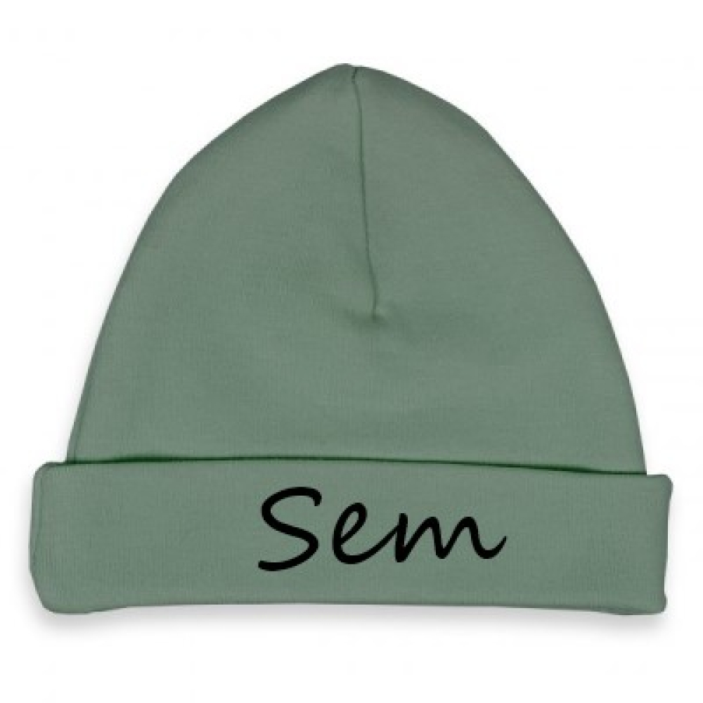 Funnies Zachte babymutsje van 100% Katoen in de mooie Stone Green kleur met de naam van de baby met een neutraal/stoer lettertype