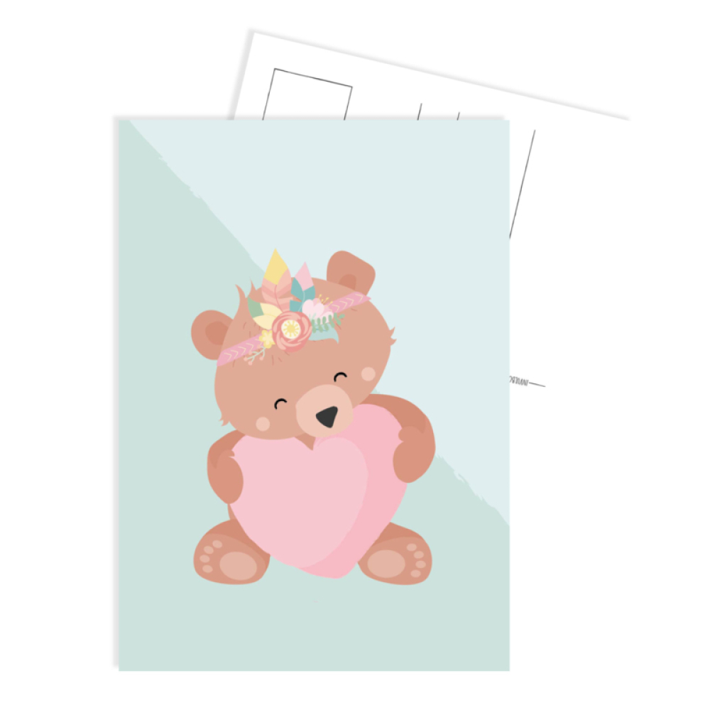 A6 ansichtkaart met illustratie van een lief beertje met een bloementooi op en een hart in zijn armen.