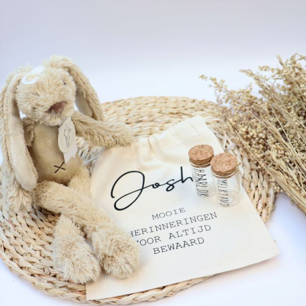 Bewaarzak voor de mooie herinneringen voor altijd bewaard met naam baby