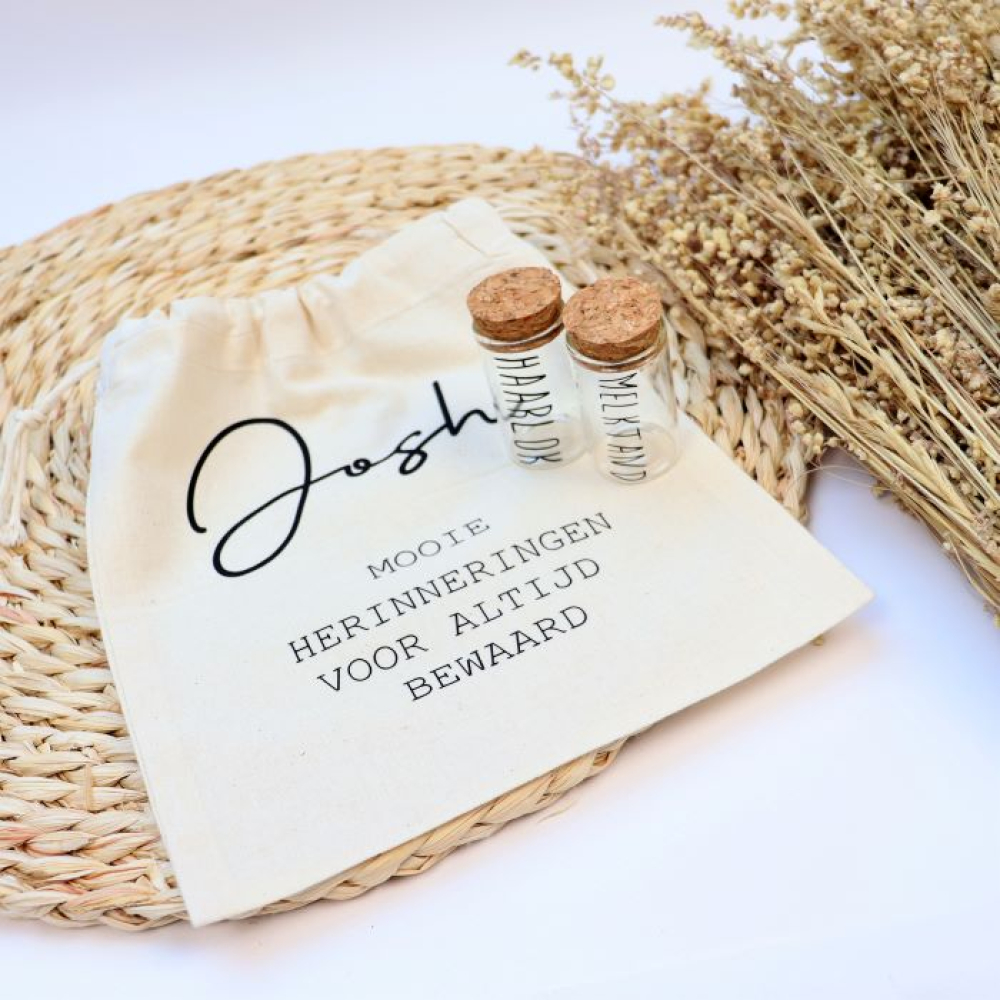 Set Bewaarzak en glazen flesjes tand en haarlok