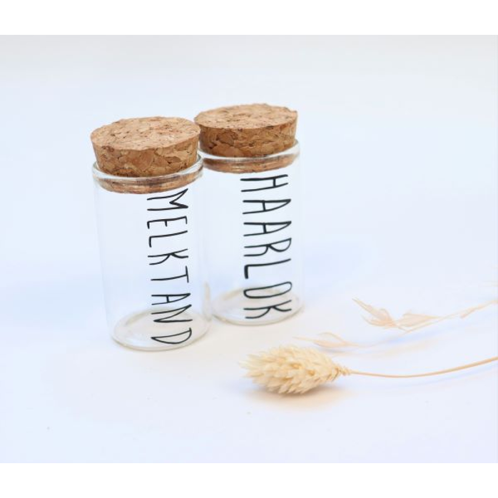 Twee glazen flesje met een kurken dop om het eerste haarlokjes en de melktandjes in te bewaren.